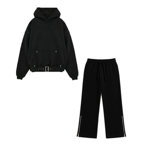This sleek black coord set features a premium hoodie and wide-leg joggers, crafted from super premium heavy terry fabric at 420 GSM for a smooth, silky hand feel. The hoodie includes an adjustable belt with a metal buckle and tightener for a customizable fit, along with The Kryp branding in striking 3D embroidery on the hood and metal rivets accenting the kangaroo pockets. The joggers offer enhanced comfort with a double waistband and metallic silver zippers at the bottom of each leg for easy adjustability and styling versatility. Perfect for those seeking elevated streetwear with a mysterious edge.