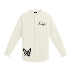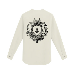A modern long-sleeve white shirt merging digital culture with timeless craftsmanship. The front features an embroidered handwritten-style phrase, “FANCULO AMORE,PROCURAMI NFTS,” (Screw love, get me NFTs) alongside a finely stitched graphic of a stylized moth—symbolizing transformation and individuality. On the back, a dramatic baroque-style sacred heart print is rendered in rich black flock, adding a bold, velvety texture. This shirt is a tactile and visual statement piece for those who blur the lines between tradition and the digital frontier.