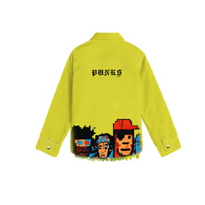 UV-reactive glow, raw-edge hem, industrial metal buttons. Pixel-god hit, encrypted Kryp success script on front panel & lower back.